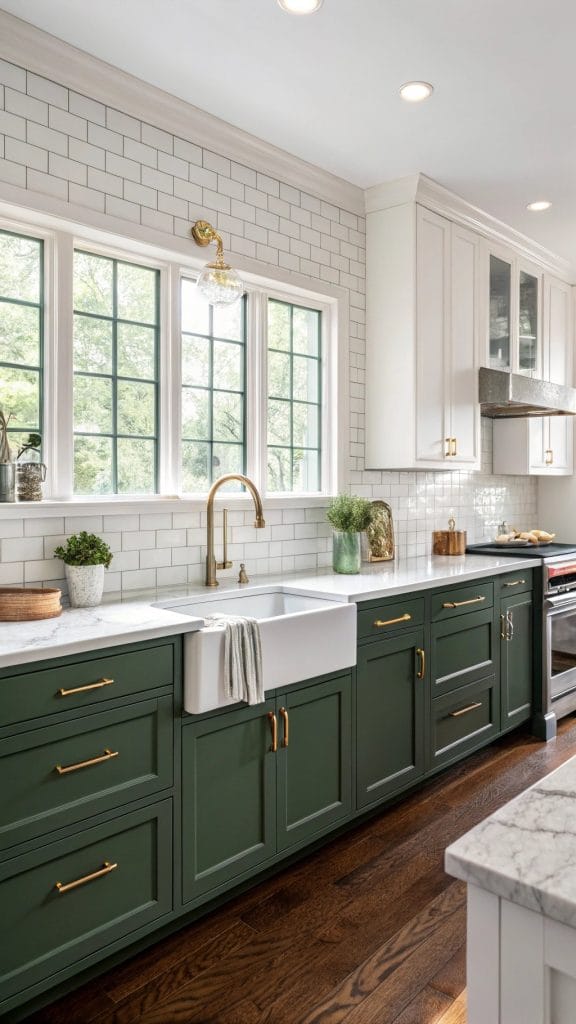 Green is trending in kitchen design, and forest green cabinets create a calming, earthy feel. This shade works beautifully with natural wood accents and matte black fixtures, adding richness and character to your kitchen.